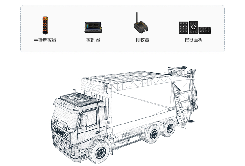 垃圾壓縮車電控系統可實現遠距離控制,支持按鍵面板和發射器互鎖,避免邏輯混亂,造成誤操作。指示燈實時指示狀態、顯示報警,采用CAN總線通訊,節省線束,大大提升了智能化程度。