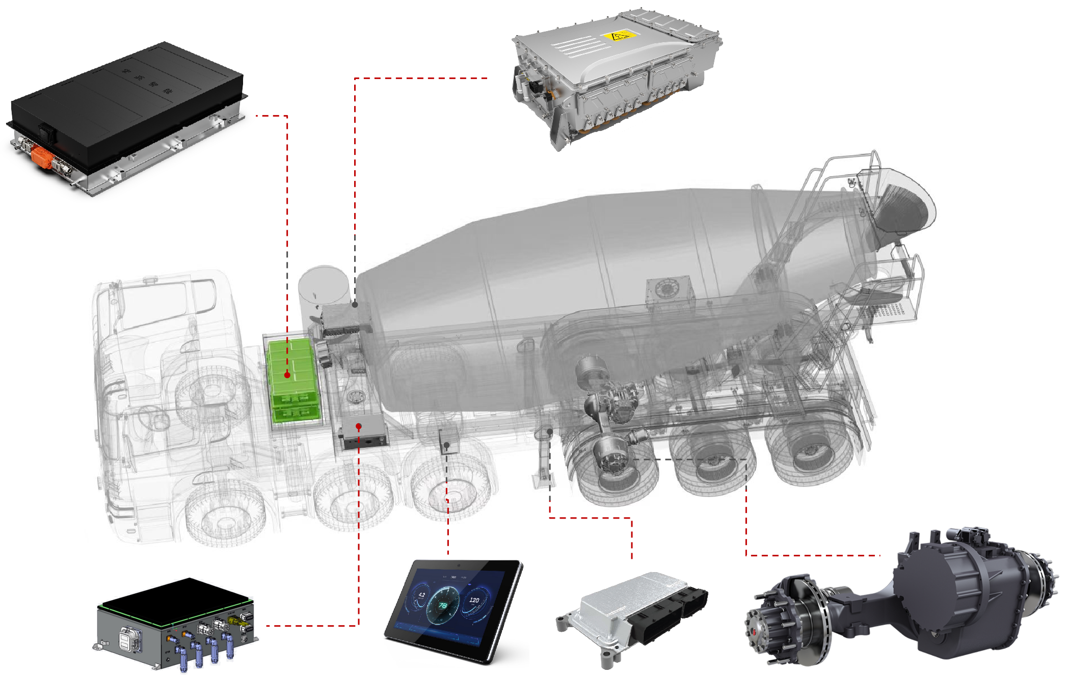 展會上,kaiyun智能的智電一體化解決方案引起了廣泛關注。工程師團隊在現場為參展觀眾詳細介紹了混合動力牽引攪拌半掛車的系統方案。該方案基于kaiyun智能歷經多年開發的eMagi智電平臺,針對牽引攪拌半掛車進行了定向開發,涵蓋以下幾個方面: