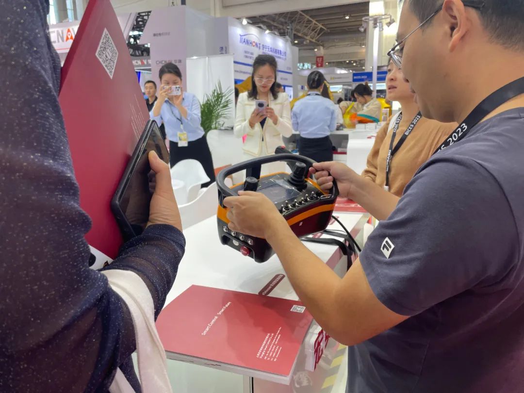 無人化也是本次展會的核心之一,在展臺另一側,多款無線遙控設備也得到了客戶的廣泛關注。eTelecom系列遙控系統,發射器面板可根據客戶的功能需求進行非標定制,面板可以安裝單軸遙控、雙軸遙控、電位計、選擇開關、撥動開關等。不僅品質可靠,并且采用符合人體力學的腰跨式設計,在工程機械、林業機械、港口機械等領域廣泛應用。